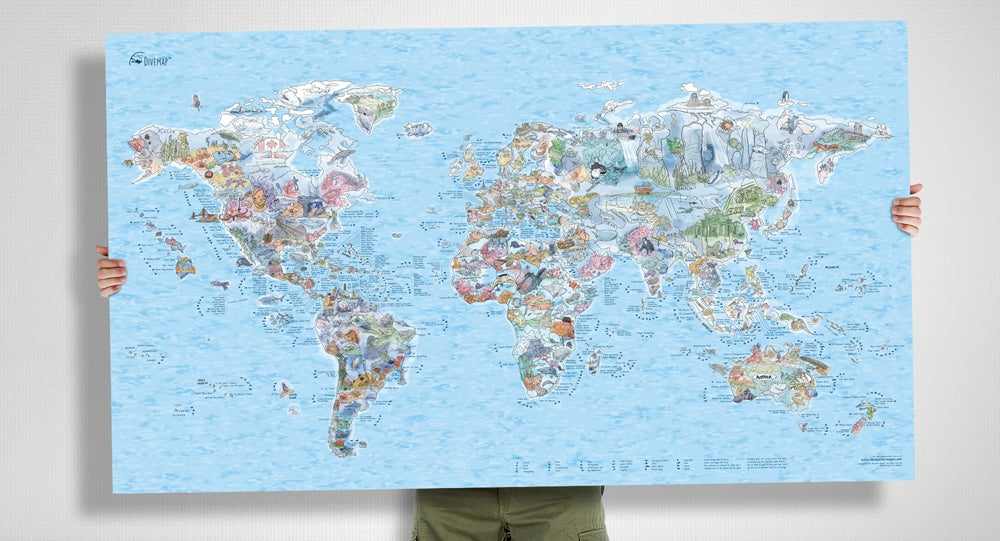 De Dive Map is een poster van de wereld met daarop de beste Duiklocaties die je in de wereld kan vinden. Je kan alvast plannen waar je graag heen wil of aangeven waar je al geweest bent. De afmeting is 96cm x 59cm. De Dive Map doet het erg goed als cadeau voor een verjaardag, kerst of Sinterklaas.